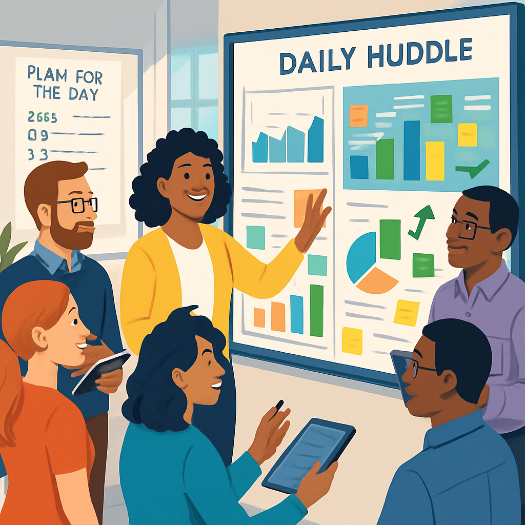 A simple visual board makes priorities transparent. Metrics such as safety alerts, production targets, patient flow status, or staffing levels are visible to all. The visuals communicate “what good looks like” and signal where attention is needed. -